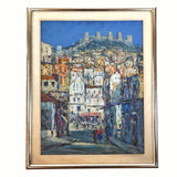 A bright street scene in oil on canvas by Portugese artist Augusto Gomes Martins (1922-1994) incorporating a view of St. George's Castle (Castelo de São Jorge) in Lisbon as seen from Largo Martim Moniz at the foot of its hilltop fortification. Signed lower left; titled and dated on verso.