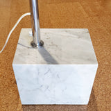 Here is an impressive 'Arc'-style floor lamp from the Guzzini brothers of Recanati, Italy.  The tall, retractable, chromed-steel arch rises from a solid Carrera marble-block base.  It terminates in an internally lighted white, Perspex dome fitted with a molded aluminum reflector that forms its rim.  The lamp is equipped with a pair of foot switches that work independently—one controlling the pair of candelabra-base bulbs that illuminate the interior of the translucent dome, the other the standard-base bulb fitted inside the reflector.  The overall height of the arch may be extended from a minimum of 7' (placing the light source at roughly 5' AFF) to a maximum of 9' (placing the light source at roughly 7' AFF).