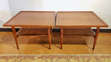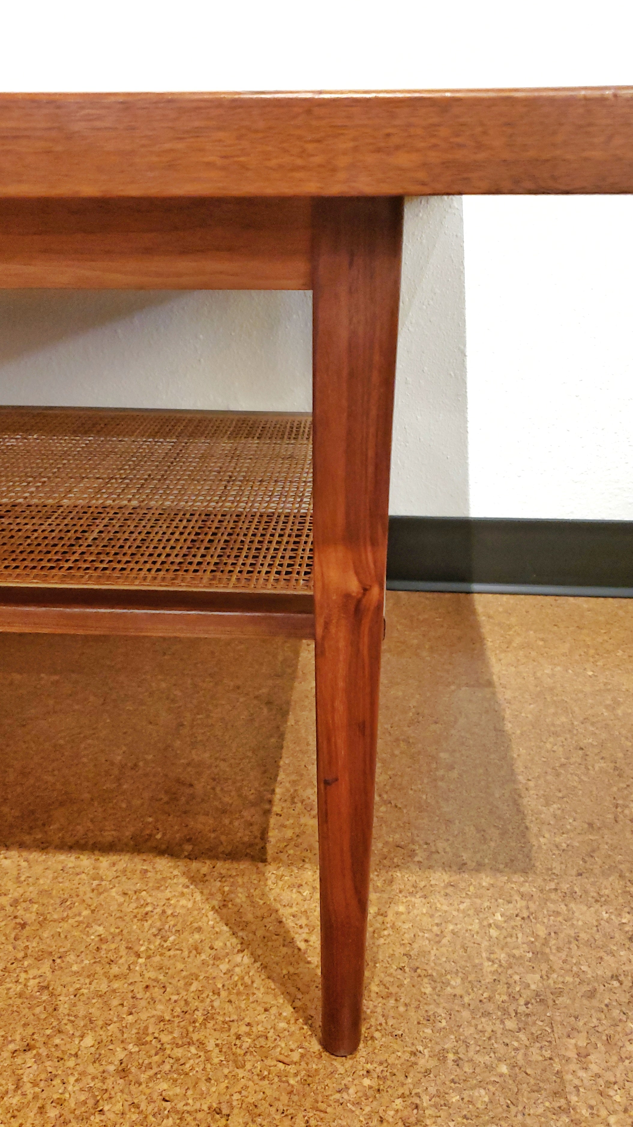 A pair of oversized end/corner tables designed in the late 1950's by Kipp Stewart and Stewart McDougall for DREXEL's 'Declaration' line of modern domestic furnishings. All 'Declaration' pieces are constructed of natural walnut. These tables feature a lower shelf of basket-woven split cane. [Offered here as a pair; we might be persuaded to part with them individually.]