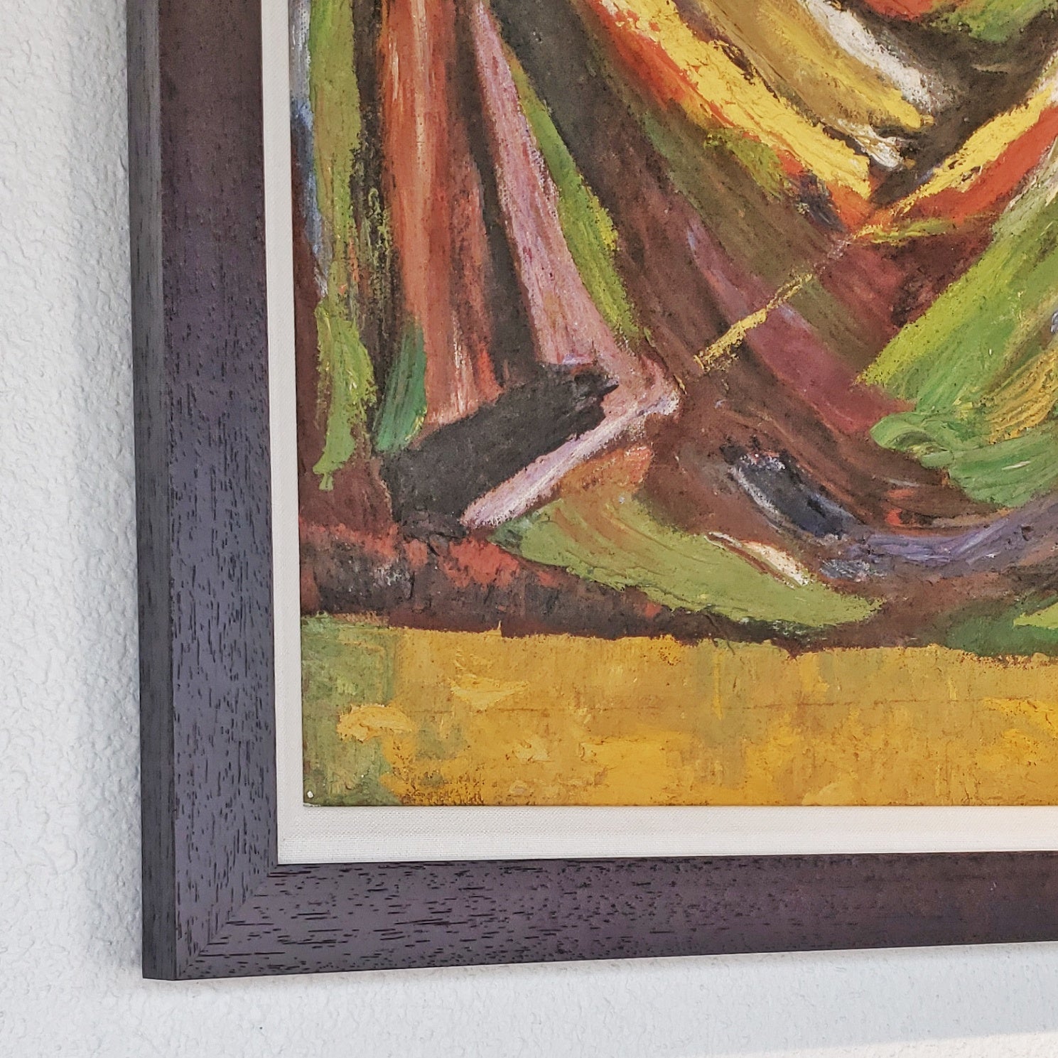 Figural expressionist portrait of a nursing woman and child by an unknown artist.  Illegible signature.  Painted in oil on canvas using an Iberian color palette.  Newly framed with a beveled lining.