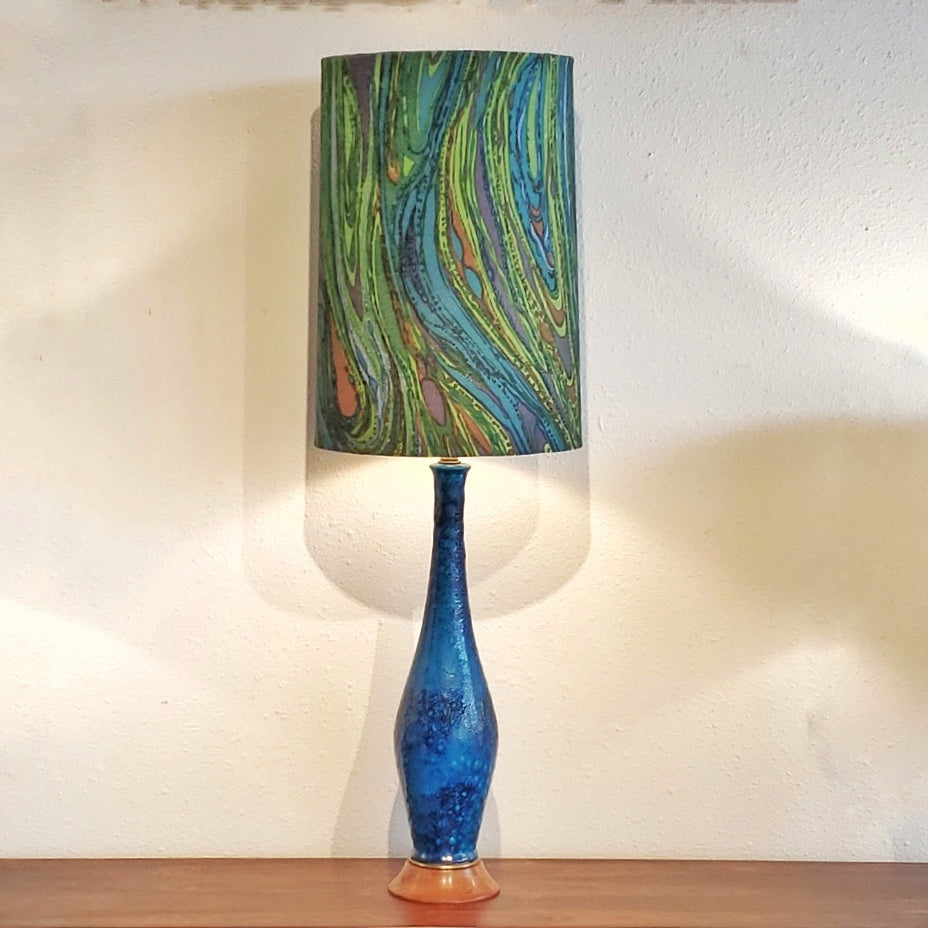 A slender, blue, lava-glazed ceramic table lamp in the style of Ingrid Atterberg for UPSALA-EKEBY.  The elongated, Scandinavian Modern style lamp body is complimented by a tall, psychedelic drum shade with a swirling pattern of blues, greens, purples, red, and a touch of black.  It rises from a solid walnut base to an assembled height of 50" (127 cm)!  Maker unknown.