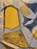 An abstract serigraph of geometric forms in shades of ochre and black, floating in a field of gray. Pencil signed and dated on the lower right—Gillian Lacey 1964. Presented in a simple black wooden frame under Plexiglass. From the corporate collection of the Chemical Rubber Company of Cleveland.