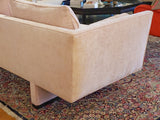 Pretty in pink! A rare model 5485 tuxedo style sofa with dramatically flared arms and an upholstered sled base in plush, powder pink velvet designed by Edward Wormley for the DUNBAR Furniture Company in 1954. It has been completely stripped and fully restored with down-filled cushions for extra chic and snuggly comfort!