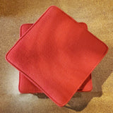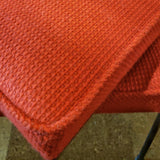 A pair of black, wrought iron No. 1305 'All ‘Round Square' stools or ottomans by Paul McCobb from his Planner Group line for WINCHENDON. Recently upholstered in a beautiful, red-orange, authentic Knoll fabric. The black-enameled frames both have (amazingly!) all of their original rubber feet.
